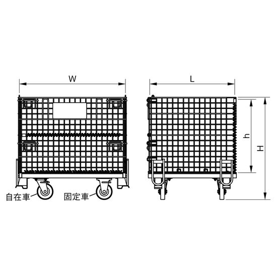 ●W(mm):1,200●L(mm):1,000●H(mm):1,003●h(mm):720●メッシュピッチ(mm):50×50●キャスター径(mm):φ150●質量(kg):100●最大積載量(kg):500●積載時積み重ね可能段数:2段●主材料:鉄●仕上:ドブメッキ